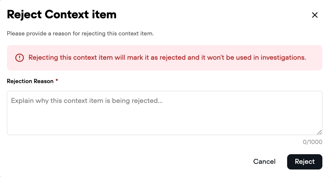 | Reject | Context is incorrect, too broad, or unjustified | Context stays inactive, analyst notified with your reason |